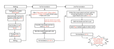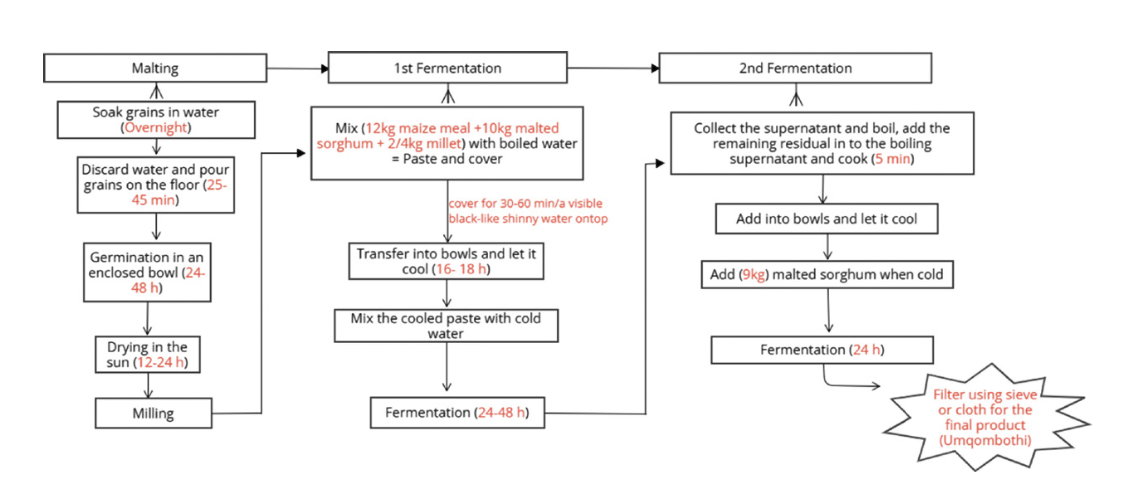 Results. Although malted sorghum is the primary inoculum (spontaneous fermentation) in most cases, some producers opt for yeast or commercially available beer as alternatives. Furthermore, the temperature (22–28°C) and fermentation times (2 to 4 days) vary among producers, reflecting diverse practices in informal umqombothi production, thus leading to many variations in product quality.